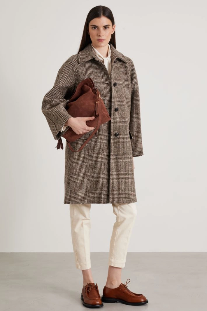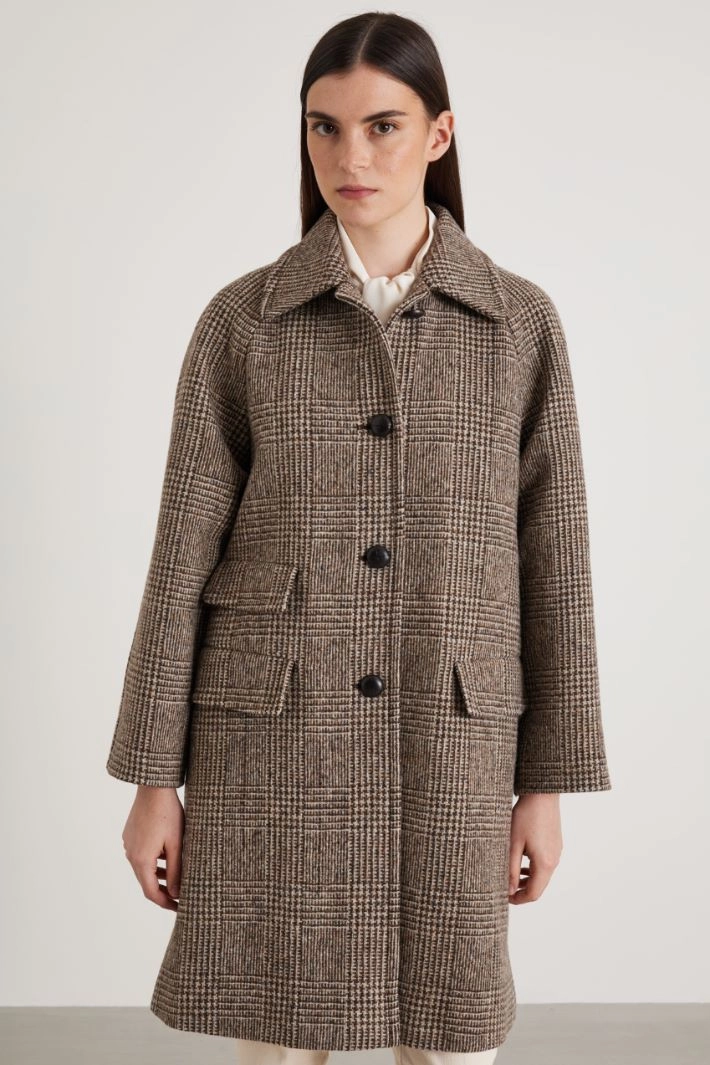 Straight-cut coat in wool tweed, with shirt collar, long raglan sleeves, side welt pockets with flap and counter pleat on the back. Single-breasted button fastening. Lined.