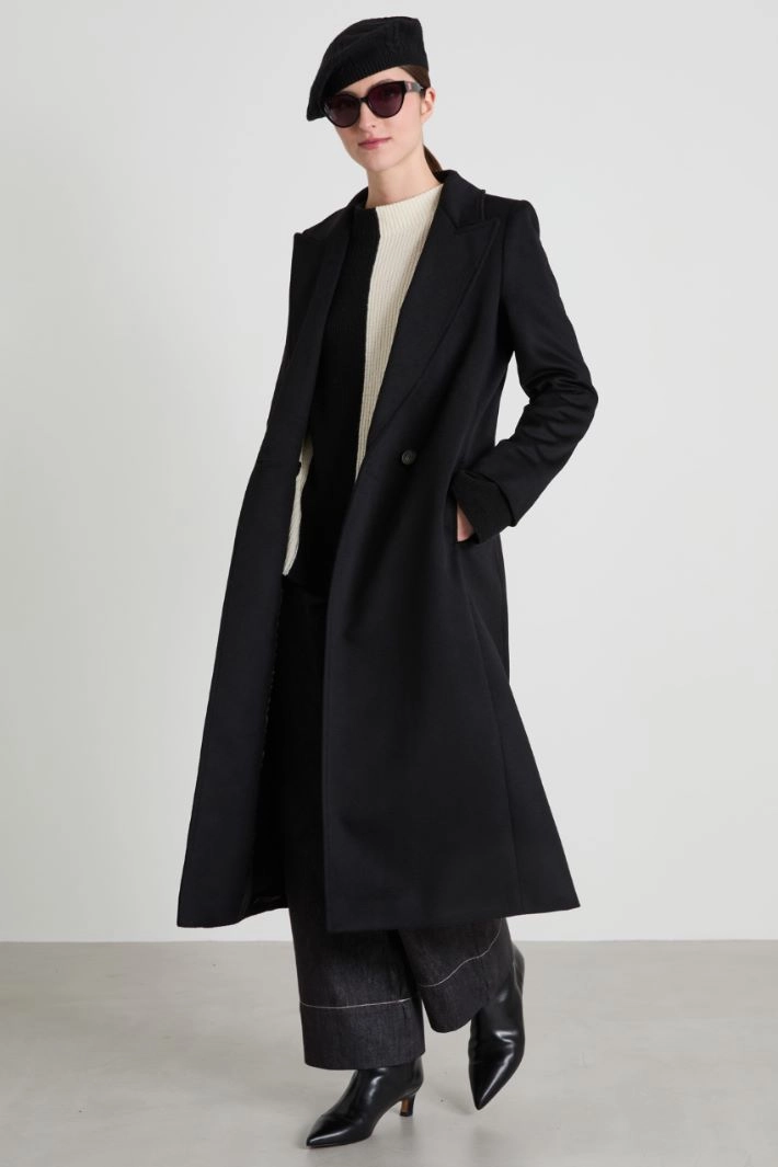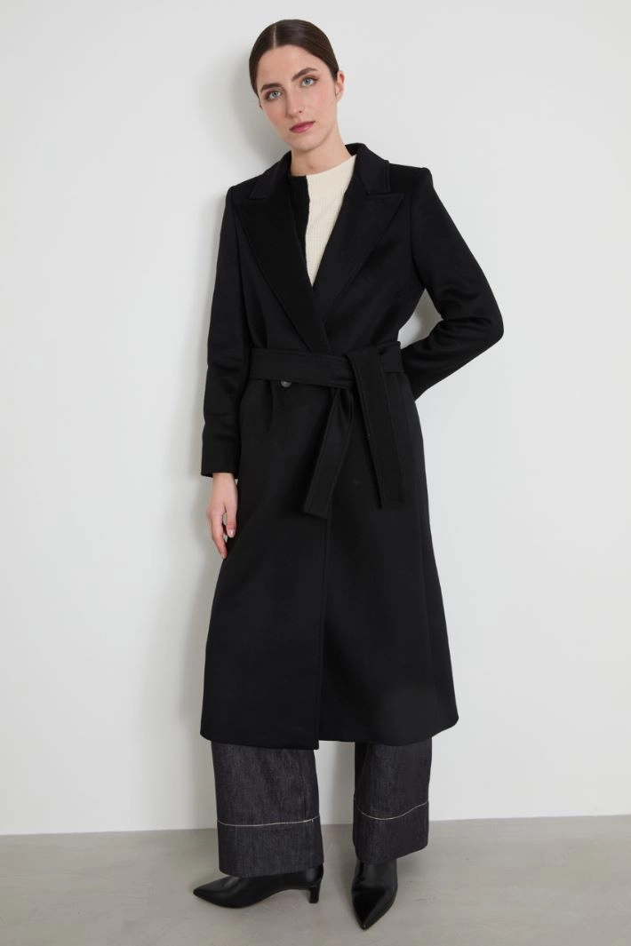 Slightly fitted coat in pure wool drap, with lapel collar, long sleeves, inset side pockets and central vent on the back. Double-breasted fastening with buttons. Lined with matching belt.