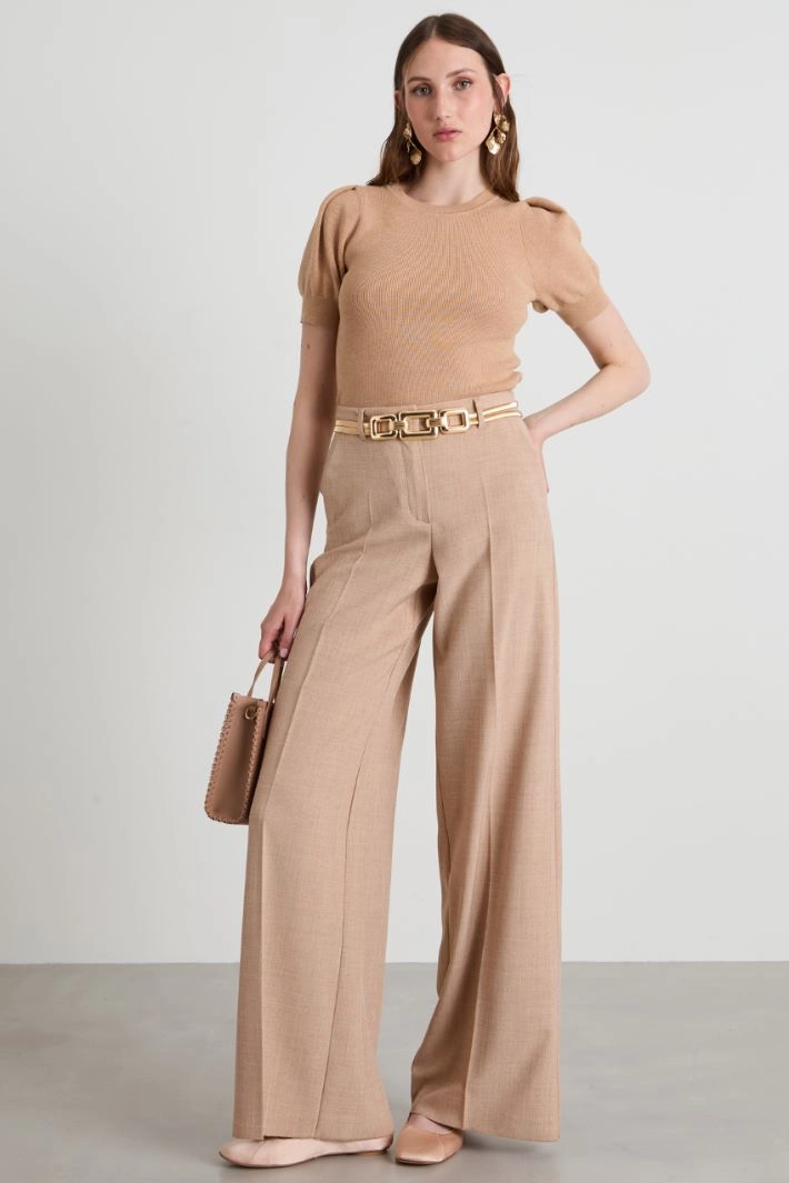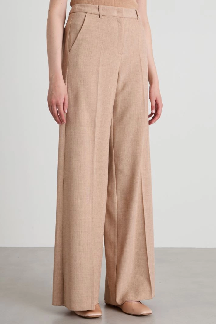 Palazzo trousers in stretch mélange basketweave fabric, with belt loops at the waist, side French pockets and welt pockets at the back, crease pressed lengthwise and hidden fastening with zip, button and hook.