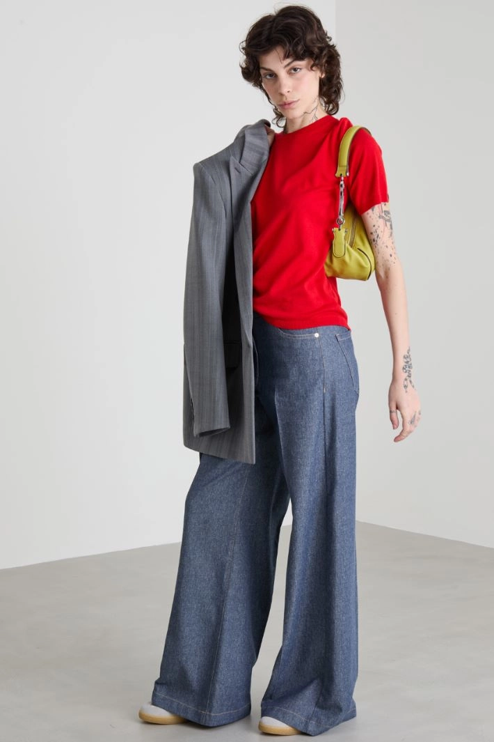 Flare trousers in stretch cotton blend denim effect fabric, with lamé fibre insert, belt loops, five pockets and pressed crease. Fastening with hidden zip and metal button.