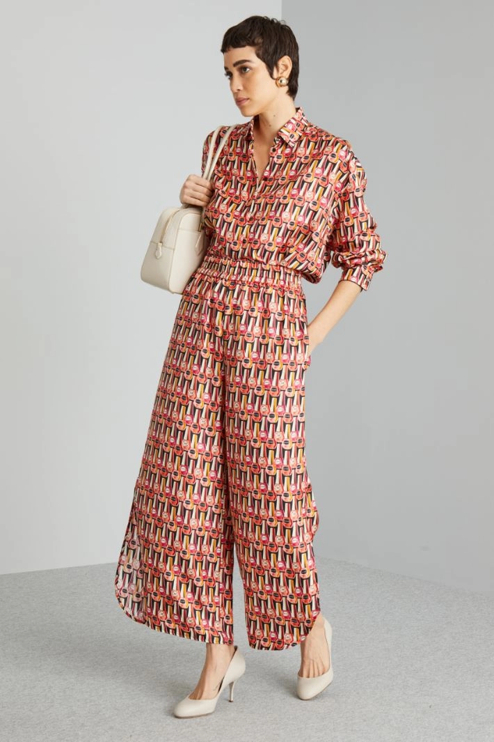 Fluid and loose fit trousers in all-over printed pure silk twill, with elastic insert at the waist, inset side pockets and side slits.