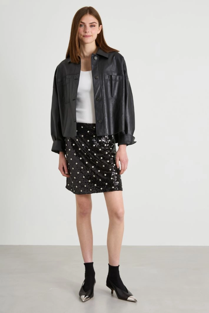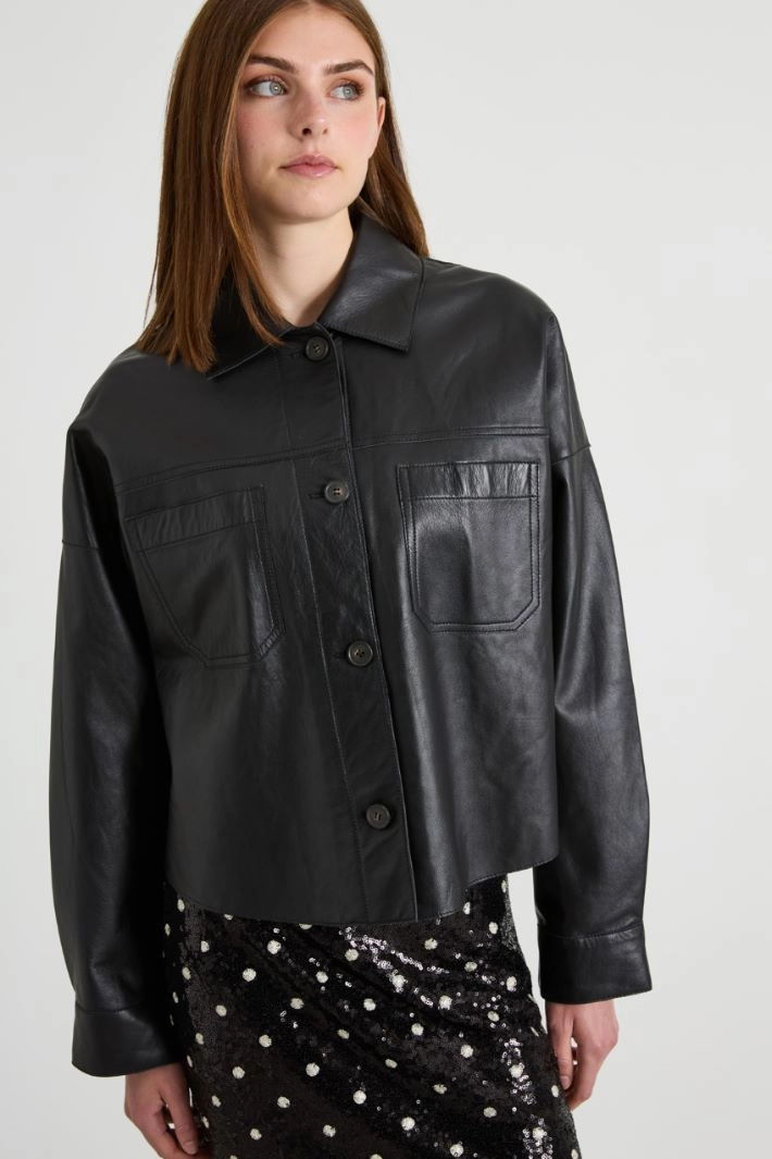Straight-fit shirt-style jacket in genuine nappa leather, with a classic collar, long dropped-neck sleeves with cuffs and buttons, and patch pockets on the chest. Side slits and rounded hem that is slightly longer on the back. Single-breasted button fastening. Lined.