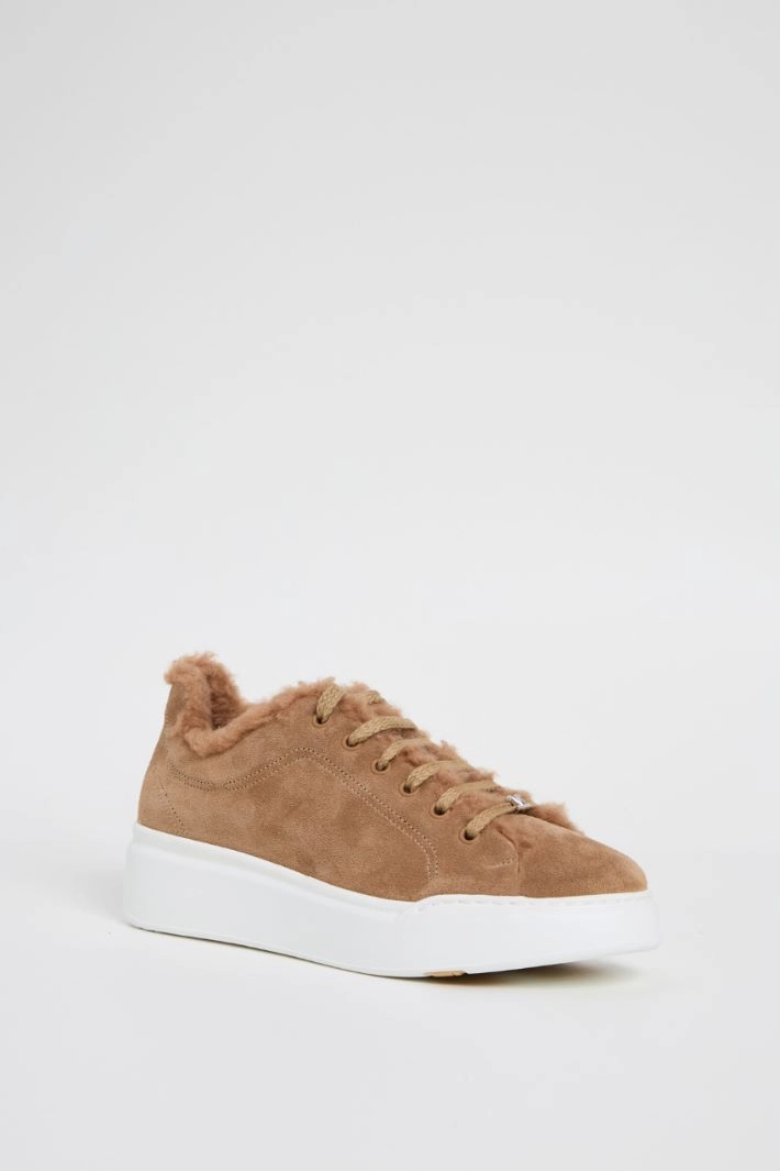 Sneakers in genuine suede leather with lace-up fastening, camel and silk plush effect interior. Rubber sole.