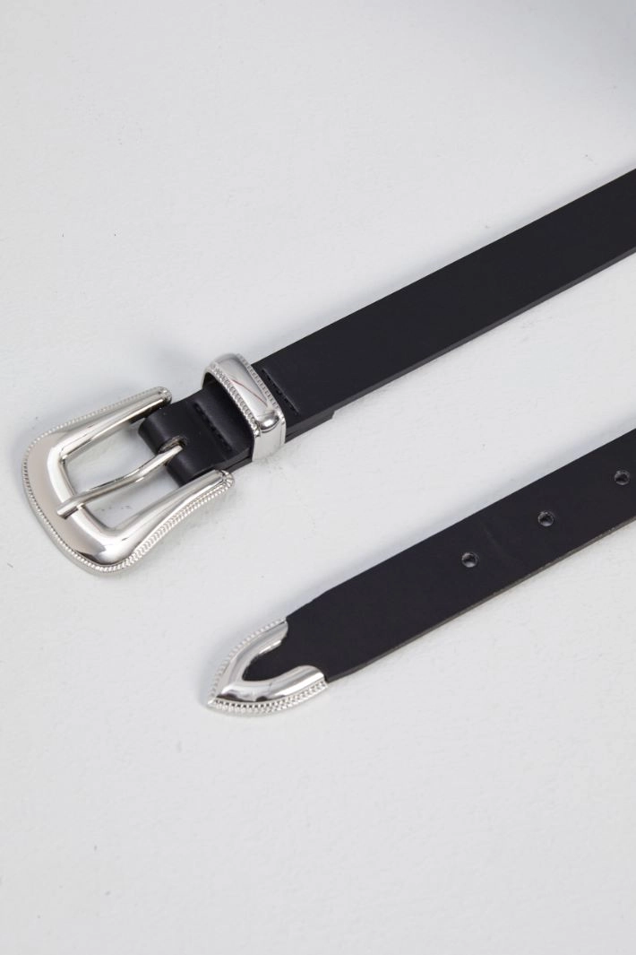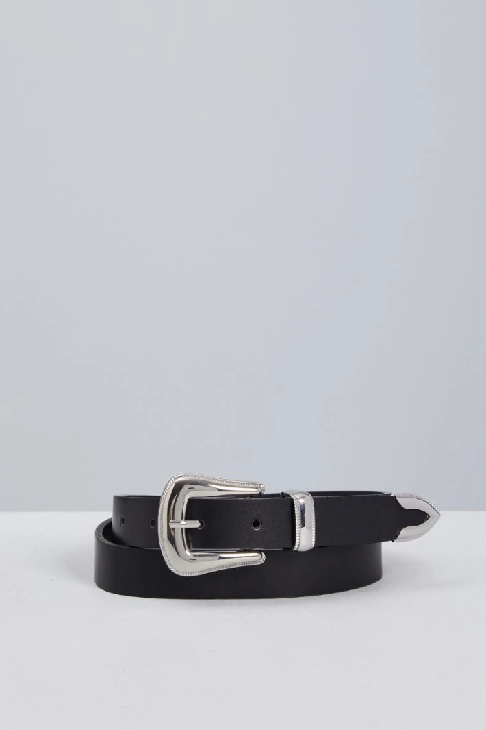 Belt in smooth faux leather, with metal tip and loop. Closure with metal buckle and pin.