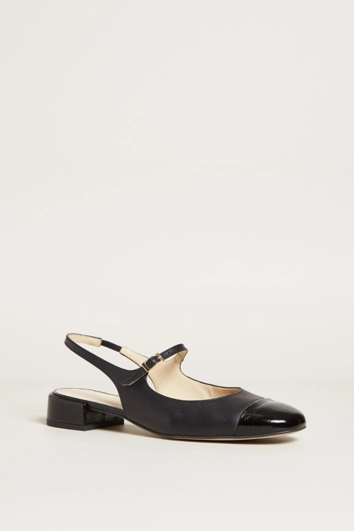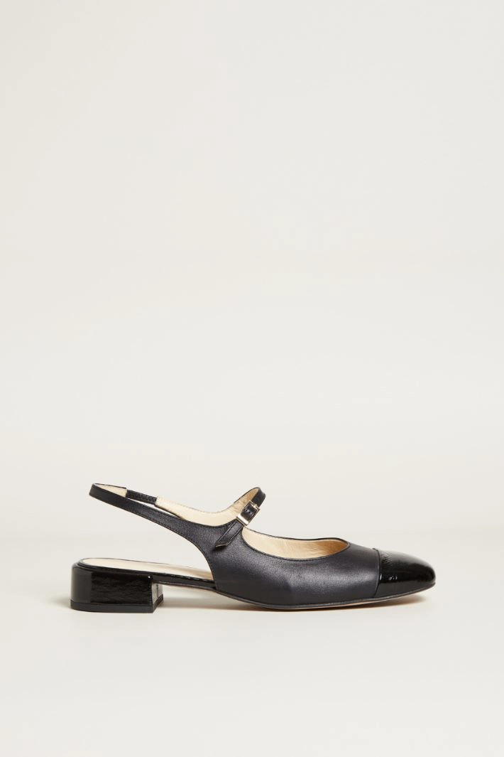 Slingbacks in genuine leather, with a rounded patent toe and an adjustable strap closure on the instep. Leather lining, rubber sole.