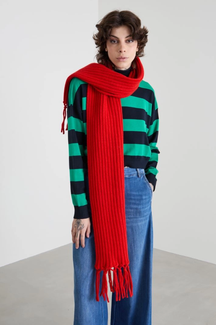 Long scarf in pure wool yarn, with ribbed details and fringe pattern at the bottom.
