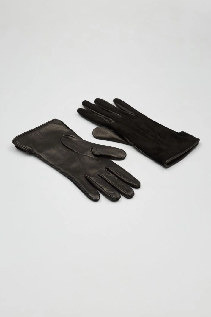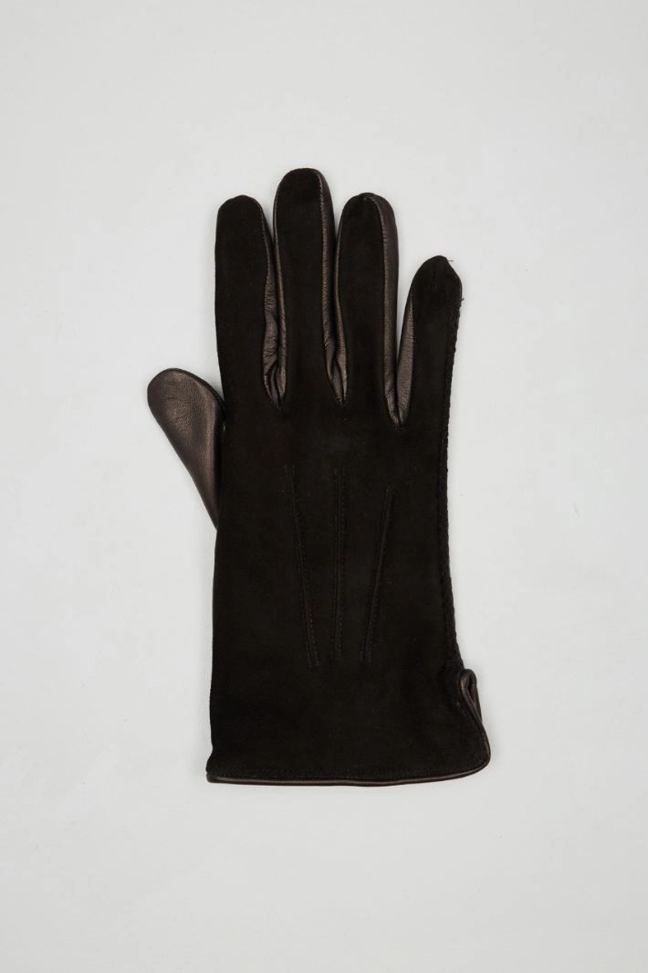 Real leather gloves with suede effect insert, raised cuts, slit at the wrist and interior lined in pure wool.